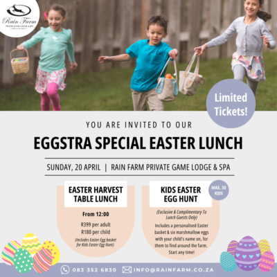 Celebrate Easter Sunday in the heart of nature with Rain Farm Private Game Lodge & Spa’s Eggstra Special Easter Lunch - a feast of flavours, family fun, and festive delights!